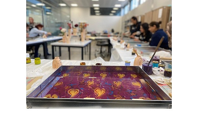 Bir başka atölye ise ebru sanatı branşında yapıldı. “Ebru Sanatıyla Çantada Ne Var” adlı atölyede ebrunun eşsiz desenleriyle bir  çanta tasarımının yolculuğu ele alındı. Yaratıcılığın ortaya çıkarıldığı söz konusu eğitimde gençler hem önemli bir sanatla buluştu hem de çantalara yaptıkları ebruları yerleştirdi. Çalışma ile ortaya birbirinden güzel ebru desenli çantalar çıktı.
