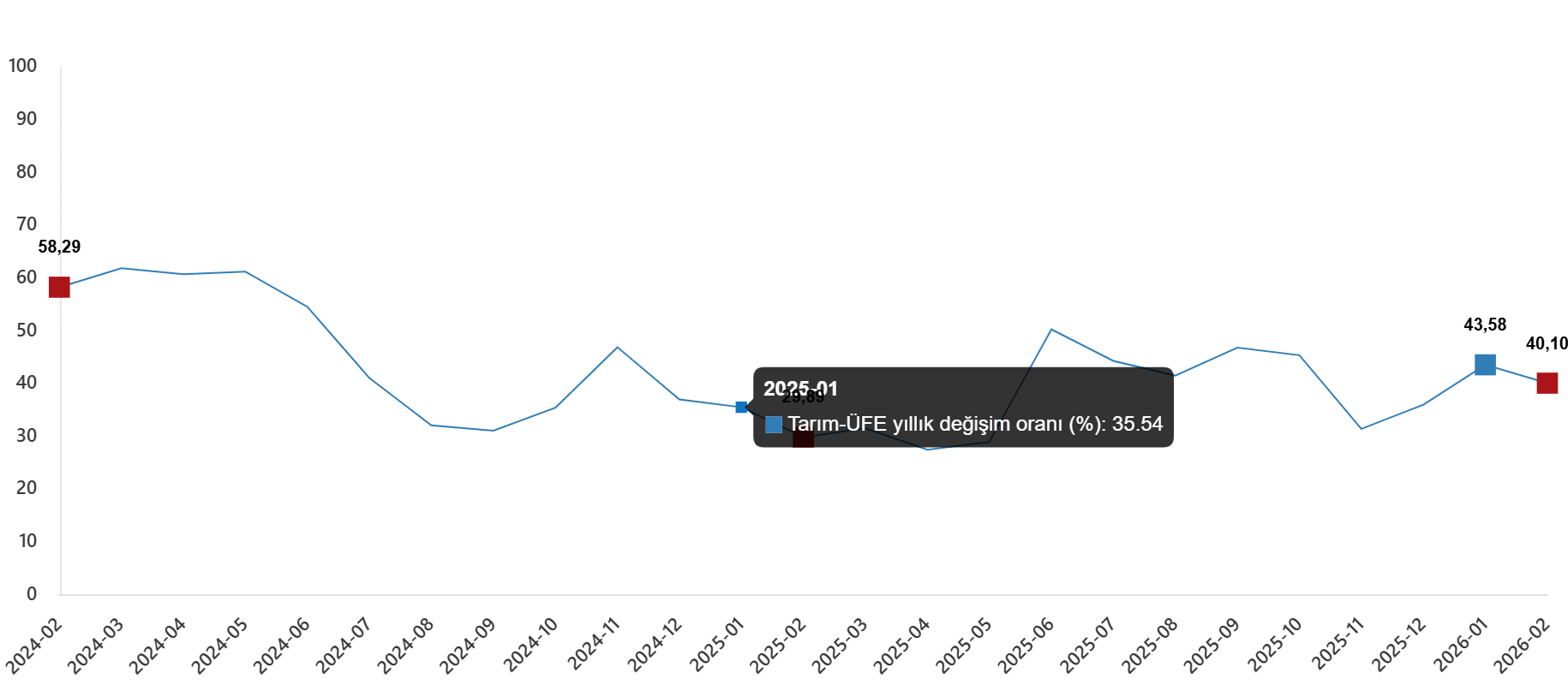 Tarım-ÜFE'de (2020=100), 2026 yılı Şubat ayında bir önceki aya göre %0,21 artış, bir önceki yılın Aralık ayına göre %8,69 artış, bir önceki yılın aynı ayına göre %40,10 artış ve on iki aylık ortalamalara göre %38,97 artış gerçekleşti.
