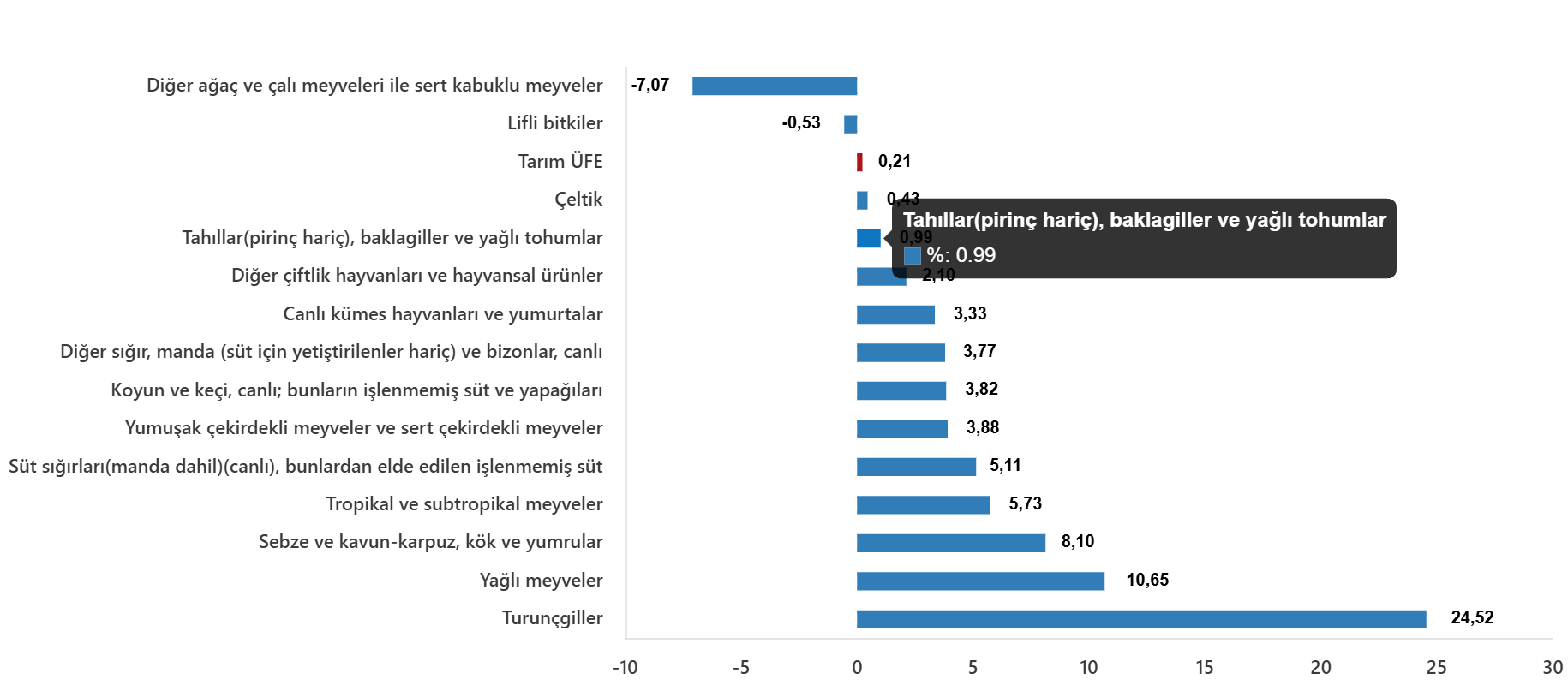 Sektörlerde bir önceki aya göre, tarım ve avcılık ürünleri ve ilgili hizmetlerde %0,03 artış, ormancılık ürünleri ve ilgili hizmetlerde %6,54 artış ve balık ve diğer balıkçılık ürünleri; su ürünleri; balıkçılık için destekleyici hizmetlerde %0,42 azalış gerçekleşti. Ana gruplarda bir önceki aya göre, tek yıllık (uzun ömürlü olmayan) bitkisel ürünlerde %4,26 artış, çok yıllık (uzun ömürlü) bitkisel ürünlerde %5,83 azalış ve canlı hayvanlar ve hayvansal ürünlerde %4,24 artış gerçekleşti.